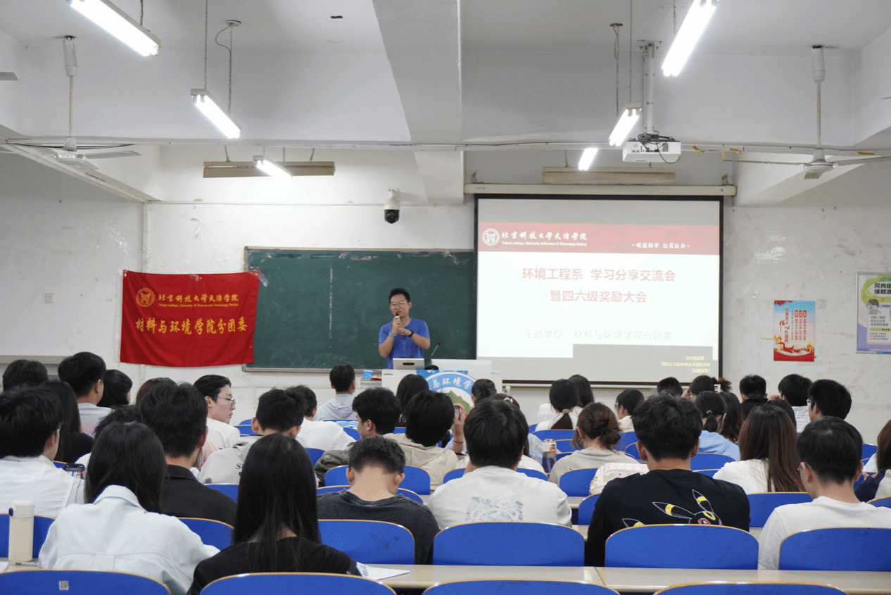 建院二十周年之际,材料与环境学院环境工程系为扎实推进学风建设,助力学子深入了解考研、出国升学等相关内容,规划学习及备考计划,于2025年5月15日在教学楼8-102举办学习交流暨四六级奖励大会,共260余名师生参加。
