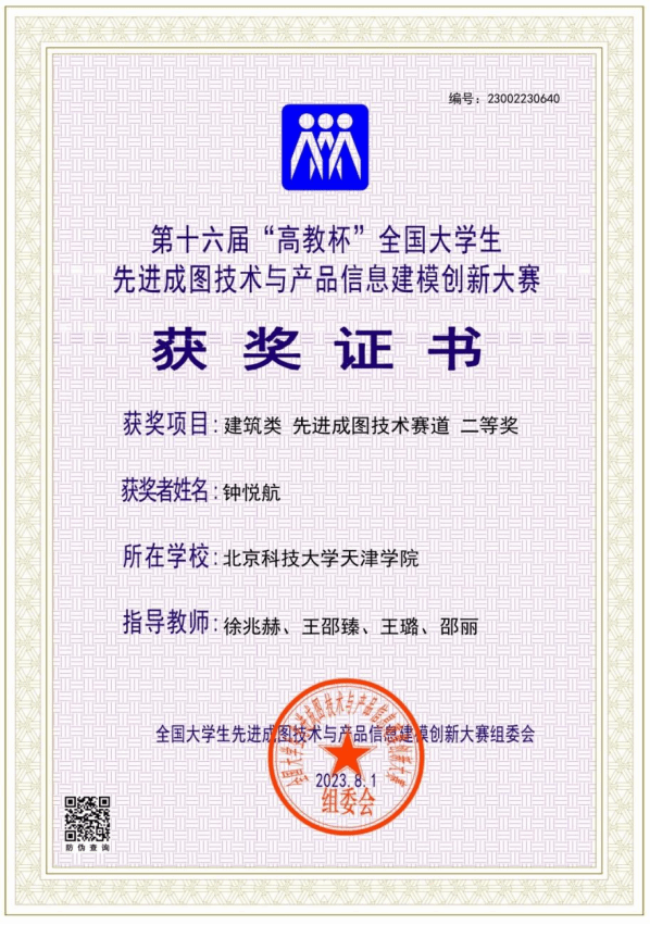 学生钟悦航(城市建设学院,土木智2101班)荣获建筑类先进成图技术赛道二等奖,指导教师徐兆赫、王邵臻、王璐、邵丽。