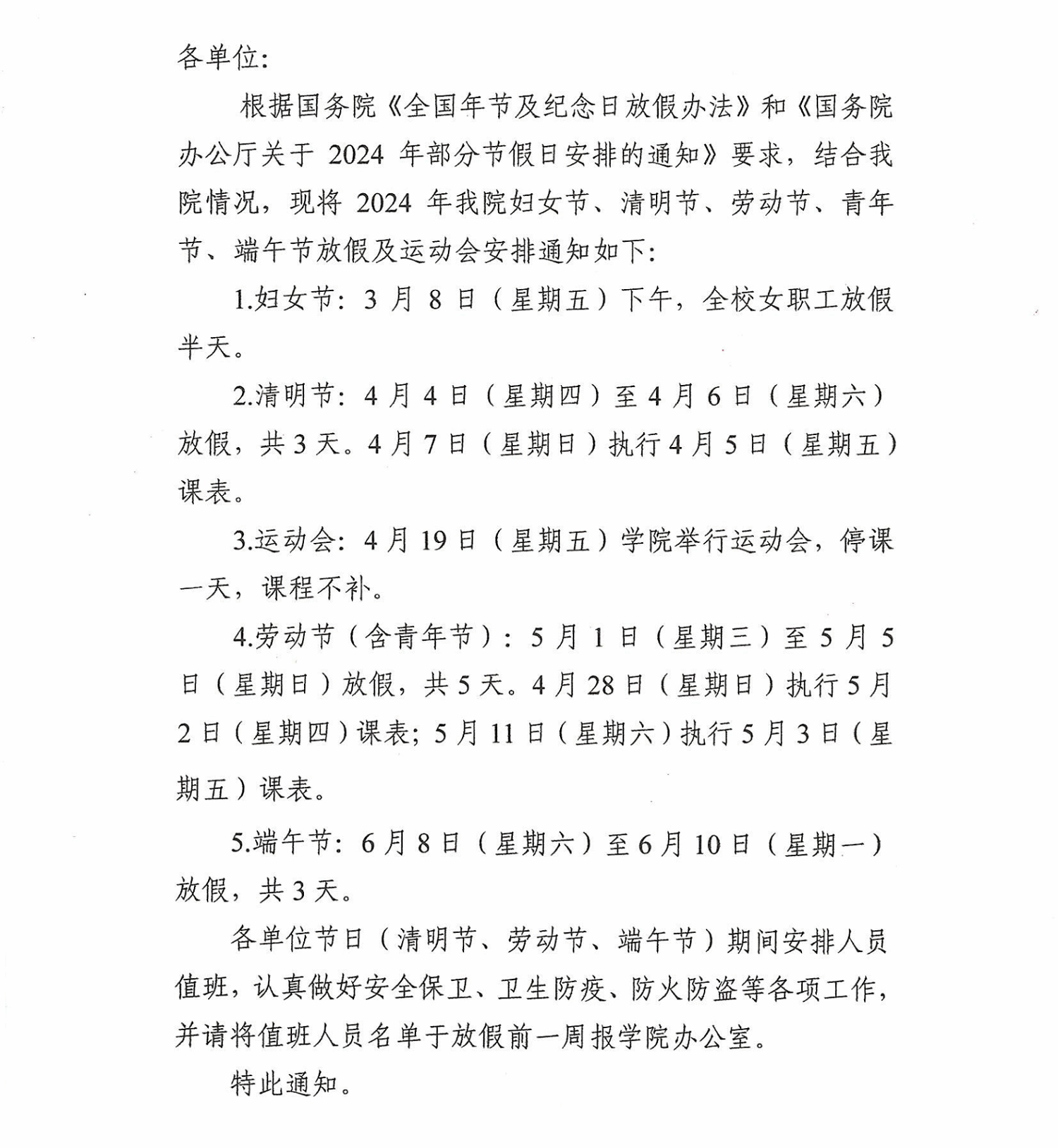 关于2024年妇女节、清明节、运动会、劳动节、青年节、端午节放假安排的通知