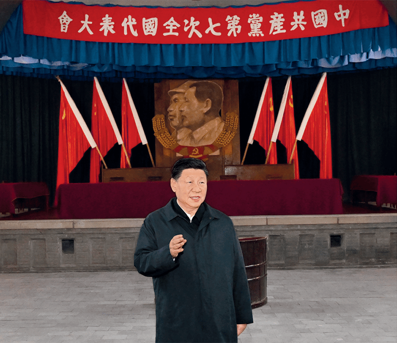 2022年10月27日,中共中央总书记、国家主席、中央军委主席习近平带领中共中央政治局常委李强、赵乐际、王沪宁、蔡奇、丁薛祥、李希,瞻仰延安革命纪念地。这是习近平在杨家岭瞻仰中共七大会址。 新华社记者 燕雁/摄
