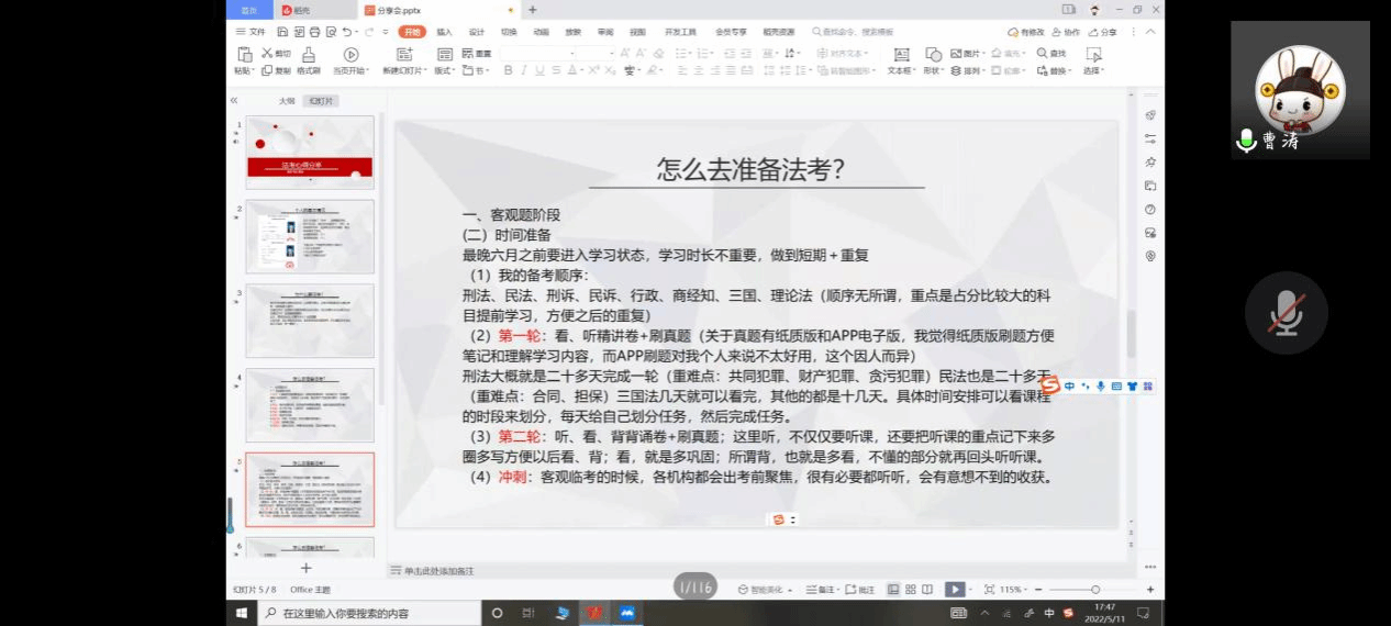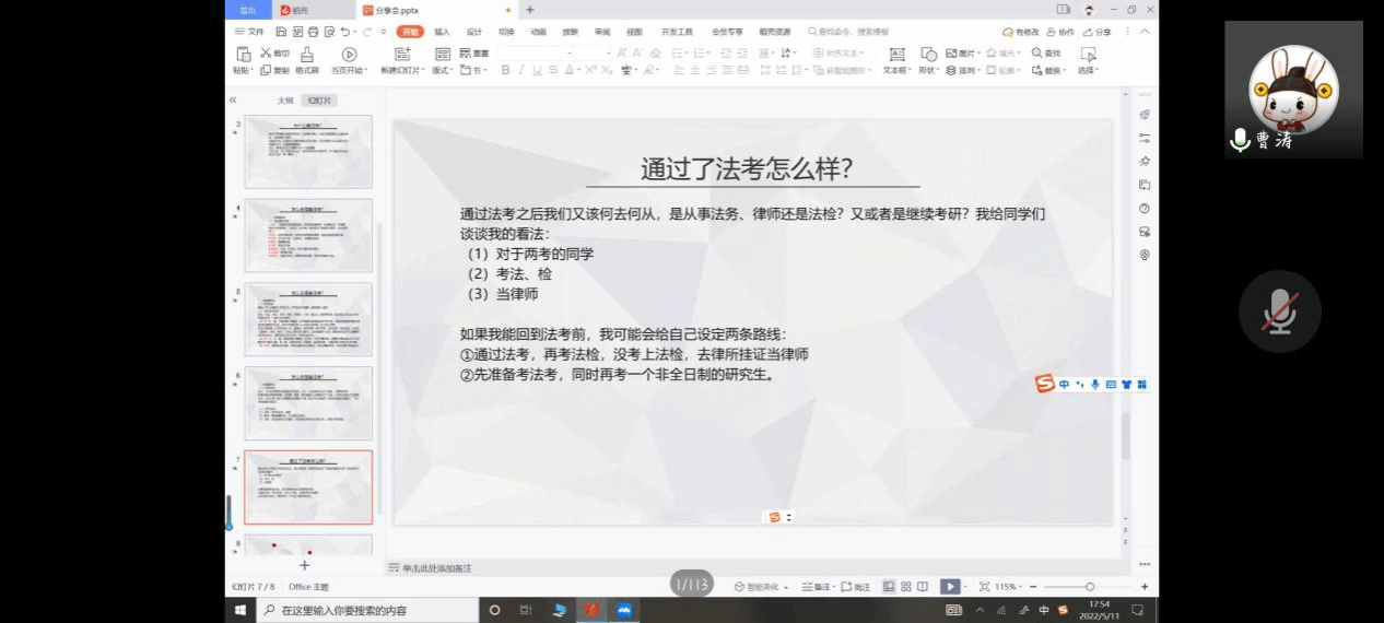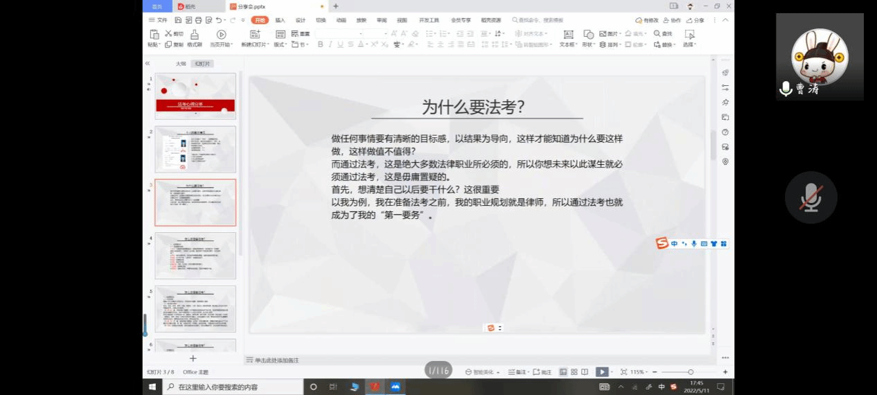 为进一步提高我系学生的考研、法考热情,明确未来就业方向,2022年5月11日下午,由法律系分团委、学生会举办的“法律系2022年毕业生经验交流会”活动以线上形式在腾讯会议如期举行,法律系各年级近500名同学参加交流会。