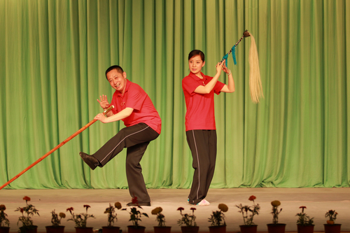 与国家京剧院领导互赠礼品。之后,国家京剧院院长宋官林先生为现场观众作了京剧知识讲座,宋院长从京剧的特点、表现形式、妆饰、配乐、身法等方面为大家讲解了博大精深的京剧文化,并由京剧院知名艺术家配合宋先生的讲解进行现场表演,展示了京剧的艺术魅力,宋先生的讲解和艺术家们生动的表演博得台下观众阵阵喝彩。