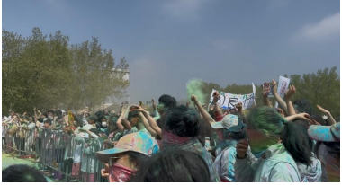 热场环节,参赛者们在志愿者的带领下,随着动感的音乐节奏,将五彩斑斓的粉末高高扬起。刹那间,绚丽的色彩在空中交织碰撞,每个人身上都沾染上快乐的气息。