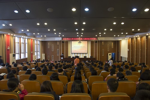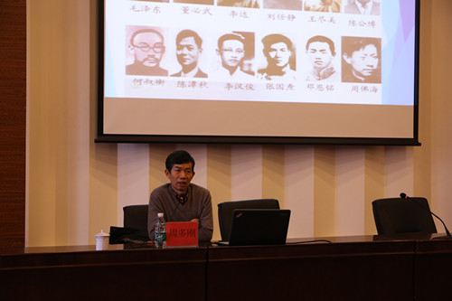 基层团组织干部进行讲座。周多刚教授以“不忘初心,继续前进”为主题,通过讲解近代以来共产党人的革命、建设、改革的历史,阐述了自清末中国被列强瓜分,到共产党的成立,中华民族同仇敌忾,共赴国难,同世界列强展开了英勇顽强的斗争,最终取得了革命的胜利,谱写了惊天地、泣鬼神的壮丽史诗,带领着中国逐渐走向富强。通过重温长征历史,使广大学生了解长征的历史不仅是工农红军战胜敌人围追堵截,克服恶劣自然环境,最终取得圆满胜利的历史,更是一部伟大的革命英雄主义的史诗,通过了解这段历史使广大学生了解革命乐观主义精神和工农红军的艰苦奋斗精神,长征的胜利挽救了中国共产党,挽救了中国工农红军,挽救了中国革命,红军长征铸就了伟大的长征精神,长征精神为中国革命不断从胜利走向胜利提供了强大精神动力。 周多刚教授呼吁广大团员干部要认真学习习近平总书记在“七一”上的重要讲话,不忘初心,继续前进,珍惜老一辈共产党人留下的胜利果实,牢记历史,拒绝战争,珍惜和平。周多刚教授以其风趣诙谐的语言和生动形象的例证博得了全体学员的热烈掌声。