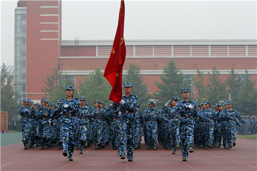 9月14日上午10时,学院迎来了2014级学生军训结业典礼。全院1700余名新生整齐列队,在依稀的秋雨中汇报两周来的军训成果。迎校旗,奏响激昂的解放军进行曲,六个分列式方队的队员迈着整齐的步伐,昂首挺胸,气势高昂地走过主席台,用嘹亮的口号向领导汇报两周的军训所得。随后进行的单兵队列示范、军体拳方队表演,花样队列表演,拼字队形表演等军训汇报科目表演将结业典礼推向了高潮。整齐划一的班队列动作,气势磅礴的擒敌拳方队,“北科天院”首字母拼音围着一个心形的拼图组字,每一项表演都赢得全场热烈掌声和喝彩,同学们用精彩的表现展示了自己在军训中的锻炼成果。