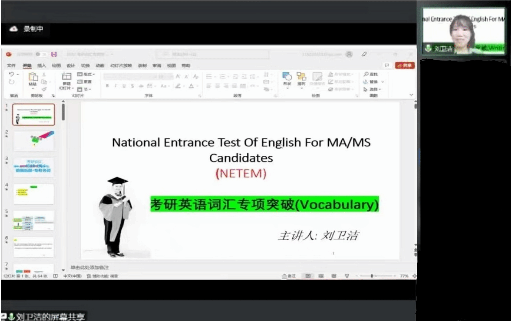 为加强学生对考研英语词汇的记忆,熟悉考研英语词汇的复习技巧,指导学生制定科学高效的考研备考方案, 2022年7月29日上午9点,由学院教务处、教师发展中心主办,外国语学院、材料科学与工程学院承办的考研备考专题讲座第四讲圆满开展。本期讲座采取线上直播形式,由外国语学院刘卫洁老师主讲,全院共400余名学生参加了本次讲座。