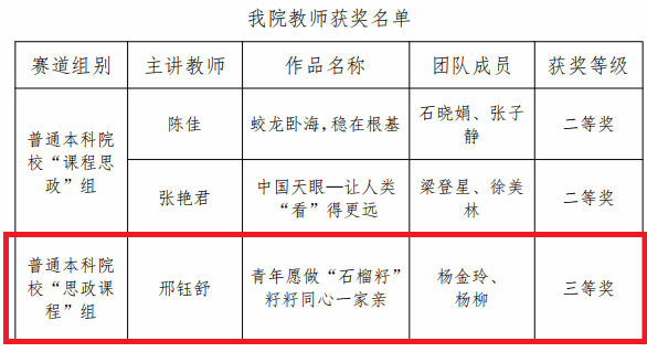 经部门推荐和学院决赛,评选出思政课程个人(团队)奖一等奖1名、二等奖1名、三等奖1名、优秀奖4名,并推荐4个团队参加市级网络评审复赛,最终获得市赛佳绩。
