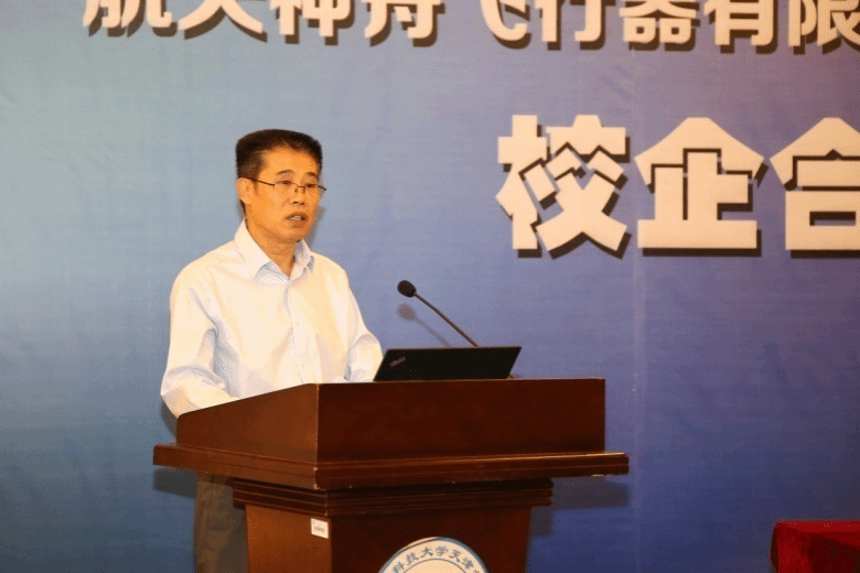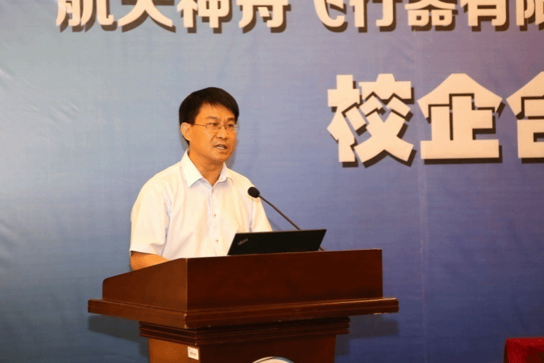 航天神舟飞行器有限公司副总经理周明致辞。他表示航天神舟飞行器有限公司是全国领先的无人机研制、生产、试验试飞和技术服务企业。公司积极服务区域经济发展,以市场需求为导向,打造市场引领、技术领先、体系完备、运营高效的军民融合产业发展平台。此次与新2