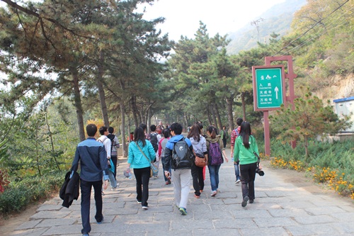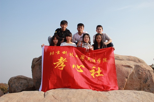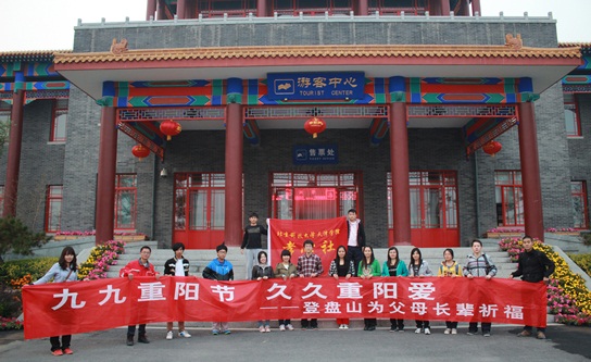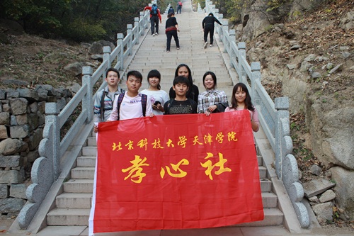 10月20日上午,孝心社一行20名同学在宣传部副部长张莉老师和孝心社秘书长田勇老师的带领下,从学院出发前往盘山。刚一下车,同学们纷纷感叹有“京东第一山”美誉的盘山其独有的壮丽巍峨。待田勇老师交代本次活动的安全注意事项后,大家便怀着对父母长辈的感恩之情,个个奋勇争先,直奔盘山山顶为长辈祈福。在登山过程中,同学们充分发扬了互相帮助,团结合作精神,并在盘山的南天门前拉起了横幅合影留念,共同祝愿天下为子女辛苦操劳的父母长辈健康长寿。