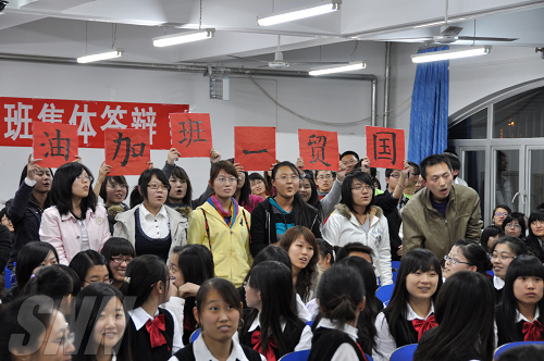 在答辩现场,各班的“啦啦队”以各种方式为班级加油。他们手拉班级条幅、齐声高喊班级口号,为上台答辩的同学加油鼓劲,充分展示了班级的凝聚力。整个答辩现场洋溢着轻松愉快的气氛。
