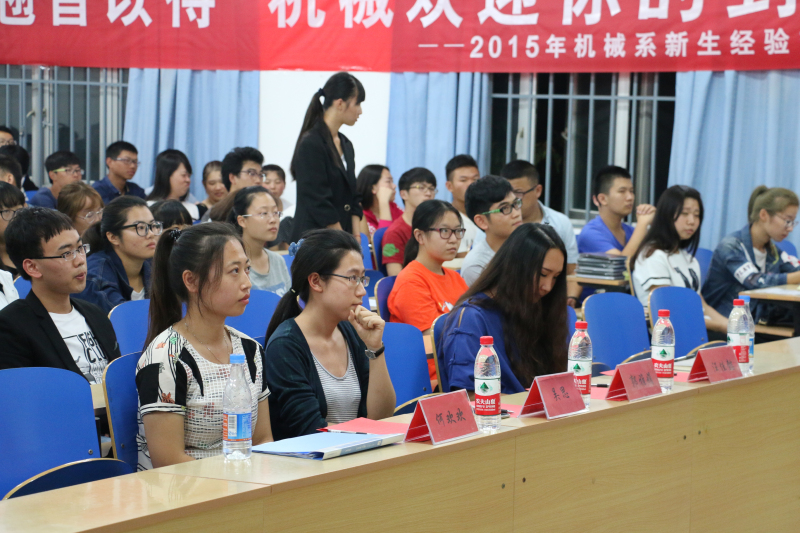 8教101室,机械系举办了2015届新生经验交流大会,机械系党总支书记郭雅娟,机械系团委书记吴思,15级导员何欢欢、汪佳懿,Mooc学社主席赵忠,以及机械系分团委学生会主席团和部长团出席此次大会。