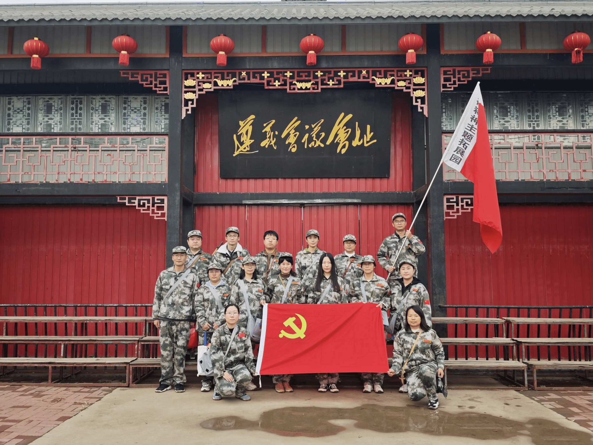 活动当天,全体教师在第六埠村红色教育基地前整齐列队,面向党旗,重温了入党誓词,并举行了庄严的授旗仪式。“出发!”随着米岩书记的一声令下,全体人员精神饱满地踏上了重走长征路的征程。老师们身着迷彩服,精神抖擞,在讲解员的带领下,沿着结合长征历史精心设计的行军路线,依次通过三道封锁线、血战湘江、遵义会议、飞夺泸定桥、爬雪山、过草地、激战腊子口,一步步深入那段波澜壮阔的长征历史,重温了那段不平凡的行军之旅。每一个场景都让我们身临其境,深刻感受到了那段艰苦卓绝的革命岁月。在行进途中,讲解员穿插讲述的感人故事和英雄事迹,更是让老师们深受感动和启发,纷纷表示要铭记红军的丰功伟绩,珍惜今天来之不易的幸福生活,将革命先烈的精神传承下去,让红色基因在新时代焕发出新的光芒。在原地休整期间,米岩书记作为领唱,还带着老师们开展了唱红歌活动。激昂的红色歌曲,不仅让大家的心灵得到了净化,更激发了老师们在新时代新征程上为党和人民的教育事业贡献力量的决心和信心。