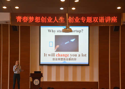 为引导和鼓励大学生创业,创业指导中心联合经济系于2016年10月27日下午三点在学院理工馆学术报告厅举办了创业双语讲座。本次讲座邀请到了KEP公司联合创始人Marry女士、王雪先生,创业指导中心王研老师,以及广大对创业有兴趣的同学。
