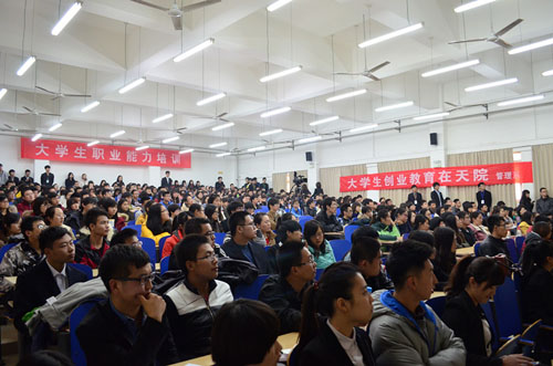 理工馆210成功举行。本次讲座有幸邀请到来自公益TTT组织的刘波老师和郭嘉淇老师主讲,院团委书记罗富臣、管理系党总支副书记王军、团委社团部部长徐兆赫、KAB创业俱乐部指导老师强顺成及四百余名学生参加了讲座培训。