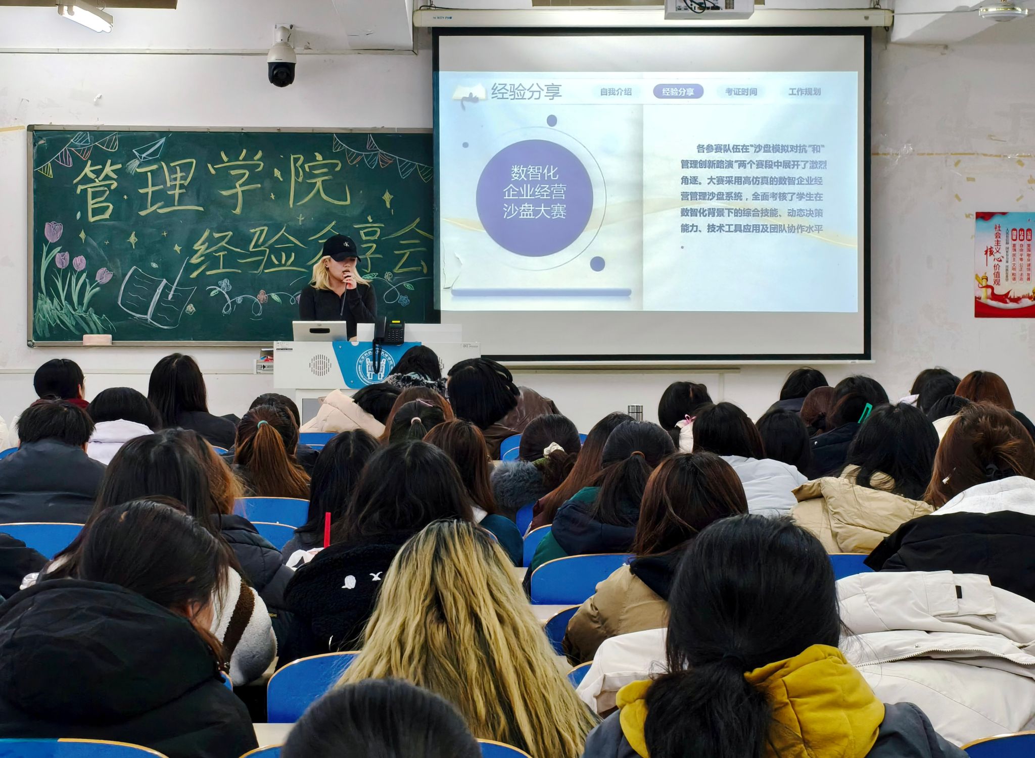 段鑫月同学则以数智化企业经营沙盘大赛为案例,系统拆解了竞赛备赛的关键环节——从吃透规则体系、制定差异化经营方案,到开展多轮模拟演练的全流程要点。同时,她结合自身成长经历,分享了竞赛所需的数据分析、决策判断等核心素养,并针对不同年级学生的学业特点,精准推荐了适配的考证类型与时间规划,实现了竞赛经验与考证指导的有机融合。