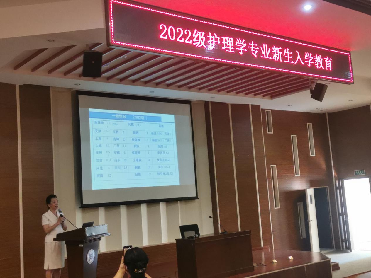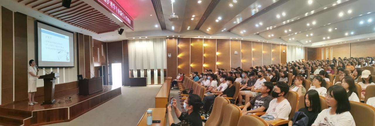 大健康学院护理学专业2022级新生入学教育在理工馆学术报告厅成功召开。护理系主任杨新月教授为学生做了一场振奋人心的“护士是阳光下最神圣的职业”专题讲座,旨在提升2022级新生的归属感,降低其迷茫感,帮助同学们尽快完成角色适应和角色转换,为未来四年的学习生活打下良好的基础。护理系副主任顾红霞、邢冬婕,辅导员陈怡菲、秘书杨艳秋、专职教师赵艳威、齐娜及169名护理学专业新生参加了本次活动。