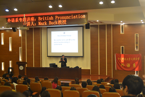 在讲座开始之前的一段关于Mark Buck的简短介绍后,Mark Buck教授就“British Pronunciation ”的主题教大家如何正确的发英音以及区分单词的重音和轻音。在讲解的过程中,教授就所讲的内容与同学互动,同学们都跃跃越试,受益匪浅。