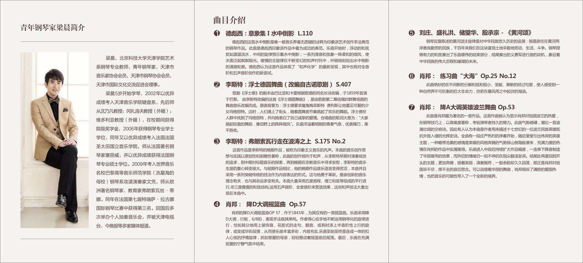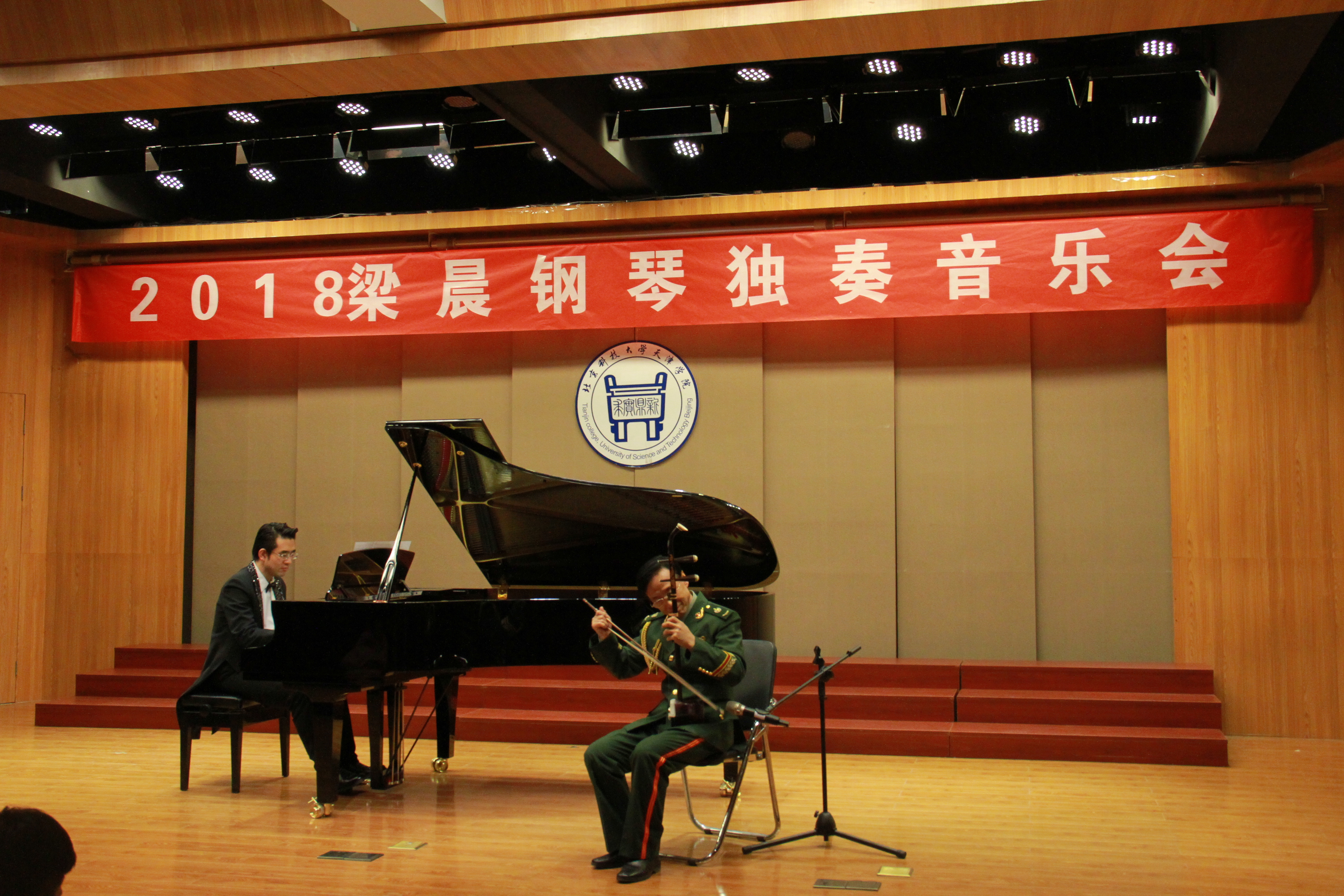 梁晨是艺术系钢琴教研室青年教师,毕业于法国圣太田国立音乐学院,先后师从于乌克兰国立音乐学院敖德萨冈扎洛夫教授,莫斯科音乐学院维多利亚教授,天津音乐学院沈乃凡教授,法国圣太田国立音乐学院钢琴家塞丽威教授,巴黎高等音乐师范学院(冼星海的母校)、欧洲著名钢琴家、教育家弗朗索瓦丝•蒂娜。本场音乐会为他的个人独奏音乐会。以浪漫主义钢琴作品为主,演奏了钢琴诗人 - 肖邦和浪漫主义钢琴之王 - 李斯特的作品,同时带来了热血沸腾的钢琴曲《黄河颂》,让观众欣赏到了古今中外的钢琴经典名作。同时,梁晨还特别邀请了他的父亲国家一级演员梁昌远先生同台献艺共同合作演奏了二胡曲《赛马》。梁晨的激情演绎将现场观众带入了不同时期的意境当中,得到了现场观众的热烈欢迎。