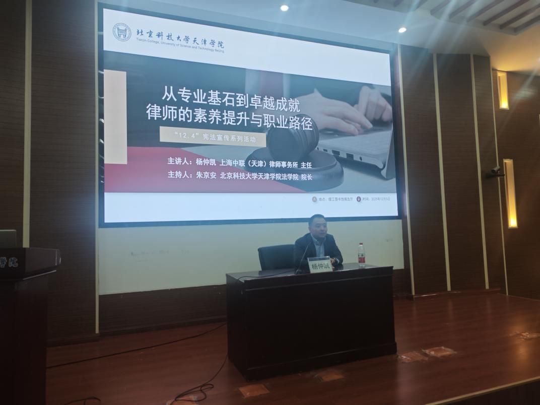 法学院于理工图书馆报告厅隆重举办“从专业基石到卓越成就——律师的素养提升与职业路”专题讲座。本次讲座学院邀请上海中联(天津)律师事务所主任杨仲凯主讲,法学院院长朱京安教授主持。