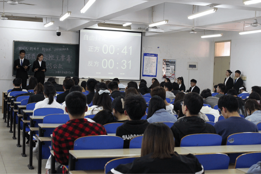本次系列活动为三个阶段,分别是初赛、复赛、决赛。比赛赛制为传统的辩论赛赛制,分为开篇立论、一对一攻辩、攻辩小节、自由辩论以及总结陈词。在4月14日开始的初赛,最终有四个班级晋级复赛,初赛的设置除了筛选复赛的优秀队伍外,最主要的目的是让新生了解辩论赛的赛程,体会辩论赛的魅力。紧接着4月28日在8教204举办的复赛比赛中可以看到各位选手脱去了初赛的青涩感,对比赛有了更明确的把握,在涉及到新冠疫情这样的辩题中,辩手们能够准确的引用例证,迅速灵敏的对对方的提问作出回答,临场反应能力得到了极大的提升,特别是在这场比赛中不再有初赛中太过口语化的表达使得比赛更为专业和可观。最终,决赛于5月12日在8教102由法学2004和2002展开对决,本次的辩题是哲学性的辩题“人生的美在于瞬间还是永恒”,哲学性的辩题在辩论中的难度最大,因为很难找到交锋点,容易在辩场上形成自说自话的情形,但是这一场的选手带给了观众一场十分激烈的比赛。正方的观点基于永恒是由一个个瞬间组成展开论述,任何事物落脚到人的时候,客观上只能把握当下,享受每一个瞬间,而过去不可改变,未来多变不能百分百把握,因此人生之美只能在于瞬间。正方的论述形成了一个完整的逻辑闭环,就好像厚实高大的堡垒,可见正方选手在私下准备充分;来到反方,反方选手从基点就推翻了正方的论述,他们从美这个角度去理解这个辩题,他们认为只有经历过历史洗涤、大浪淘沙下来还被人们所认识为好的东西才叫做美,因为每一个事物具有每个时代的人所处环境的片面性认知,因此就必须要经过长时间的考验和不同人的体会,最终还能被称作为美的东西才是美,所以这些事物必然要被附上时间的永恒特质。双方的观点争锋相对,在自由辩环节中展开了十分激烈的观点碰撞,从我们身边的每一个成功的小细节,到儒家思想这样恢弘的理论,选手们在回答、提问和引例时都信手拈来,在辩论赛场上意气风发,展现了作为一名成熟的辩手应有的气场和态度,与此同时场下的观众也听的津津有味,现场的所有焦点都聚集在辩场上,相信通过此次比赛,同学们都能感受到辩论的乐趣和它所能够带来的人生思考。