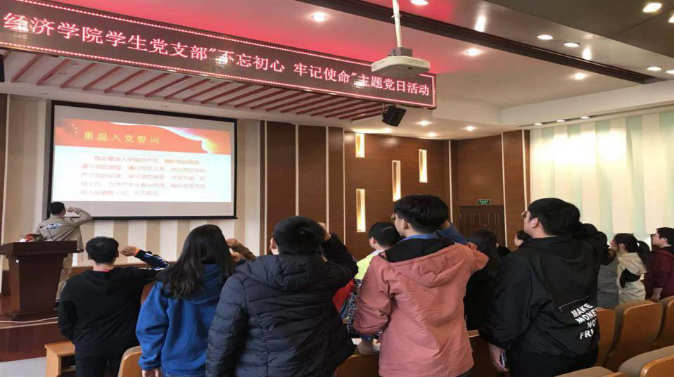 经济学院学生第一党支部全体党员同志及积极分子代表参加了本次活动。首先,支部书记赵怡带领党员同志重温入党誓词,提出党员在今后的工作和学习中要不断增强党性观念,不忘初心,砥砺前行,以实际行动为党旗增光添彩。