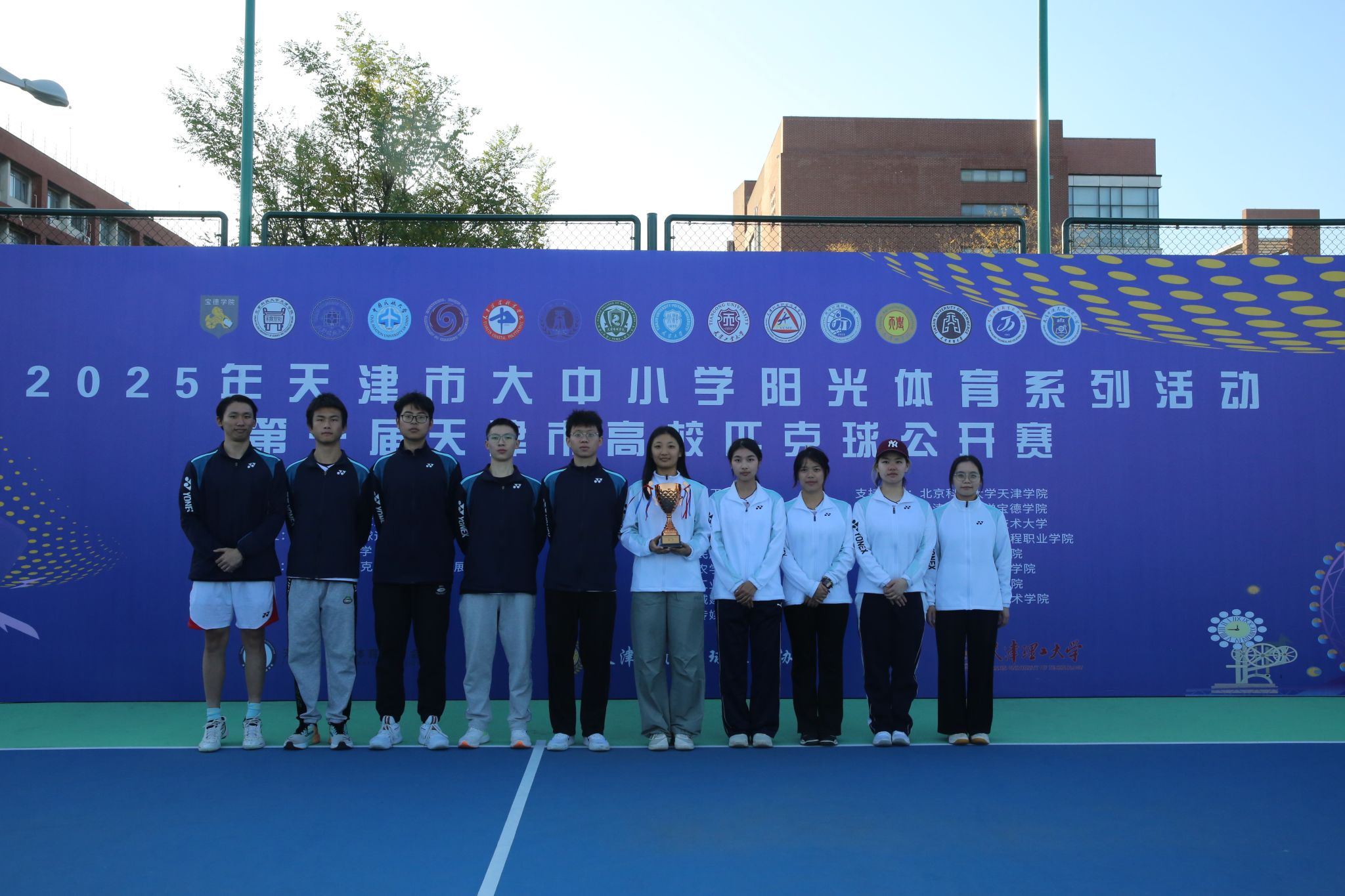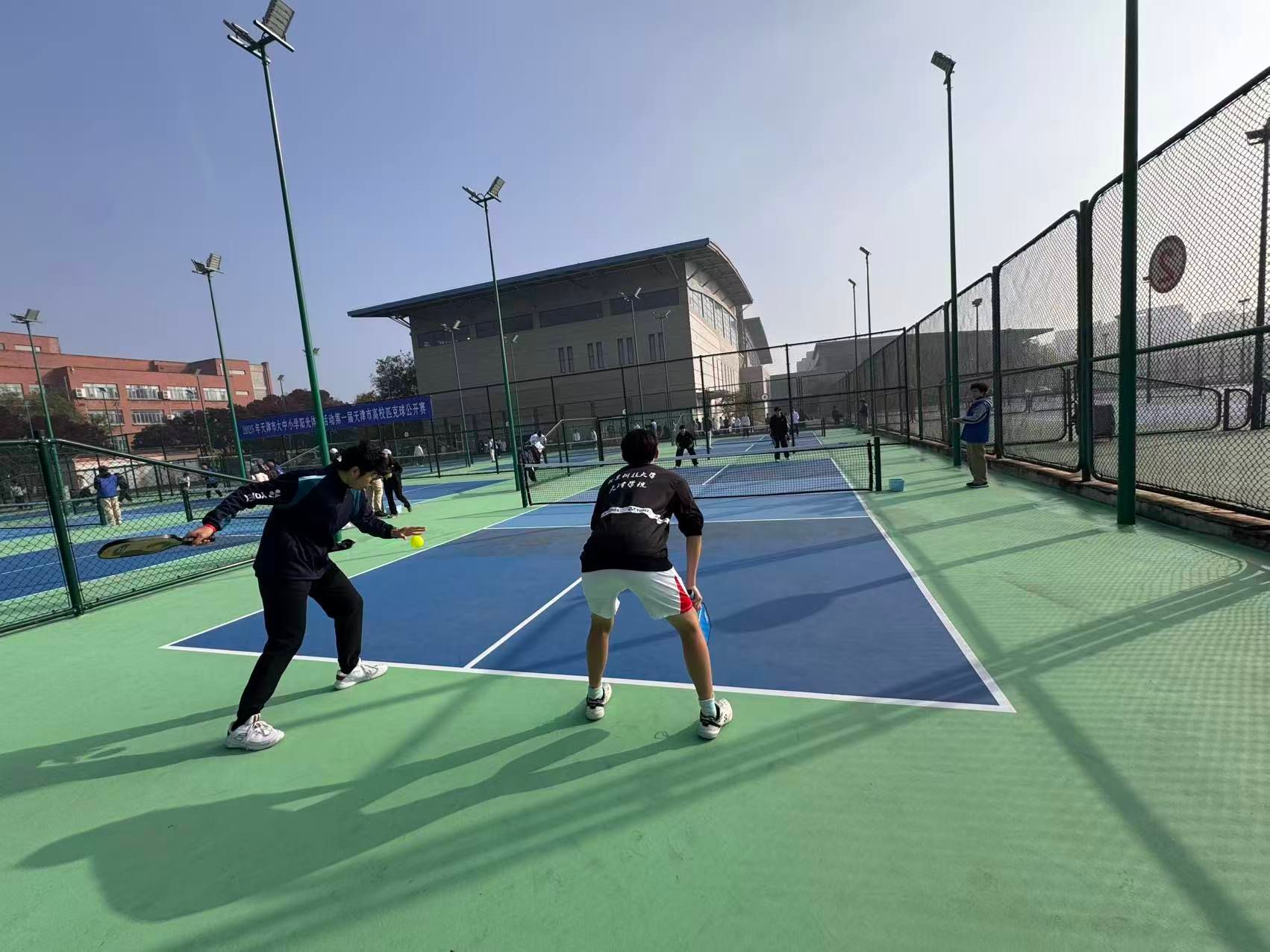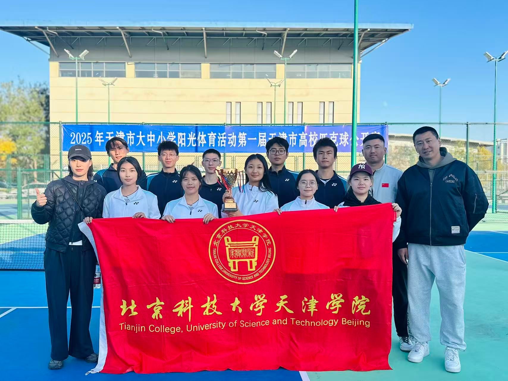 2025年11月1日,由天津市教育委员会、天津市学生体育联合会和天津市匹克球运动协会共同举办的2025年第一届天津市高校匹克球公开赛在天津理工大学匹克球场激烈开打,本次赛事吸引了全市17所高校,共计200余名运动员、教练员和领队踊跃参与。新2 由体育部赵文男、杨永康、程旸三位老师任教练员和10名球员组队参赛,经过激烈角逐,新2 匹克球队获得天津市高校团体第三名(季军)。