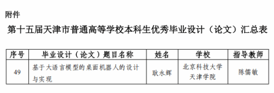 信息工程学院陈儒敏老师指导、2024届毕业生耿永辉完成的毕业设计《基于大语言模型的桌面机器人的设计与实现》荣获天津市级本科生优秀毕业设计(论文),获奖信息如下: