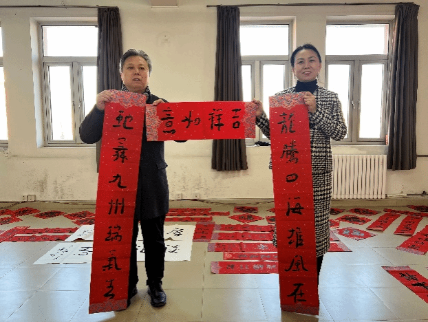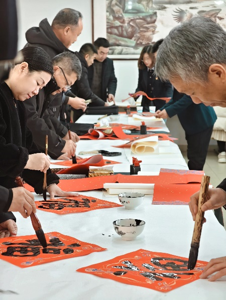 揭牌仪式结束后,来自天津书协、篆刻委员会以及宝坻区书协、篆刻家协会天津市书法家协会的艺术家们现场挥毫泼墨,为师生们书写春联和福字。吸引了学生以及在校教职工前来学习和体验。一幅幅寓意吉祥的春联和福字,不仅传递了新年的祝福,也展现了书法艺术的魅力。师生们纷纷围观,赞叹不已,并积极参与其中,体验书法的乐趣。
