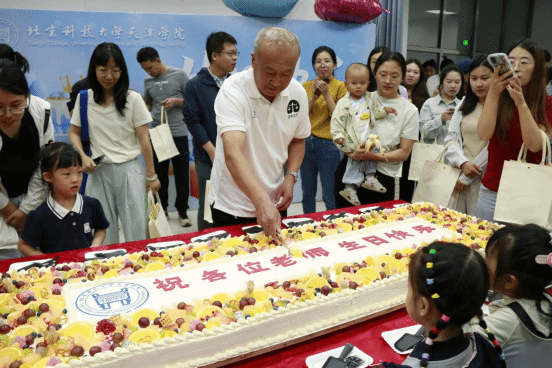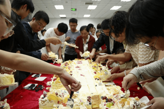 到场的老师们同唱生日快乐歌,吹蜡烛,蛋糕的香甜在空气中弥漫,一块块分递到大家手中,欢声笑语也随之此起彼伏。
