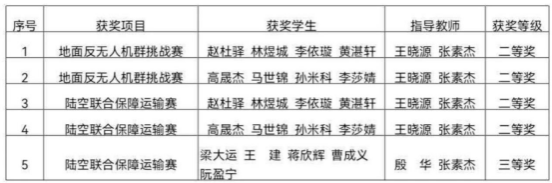 4所高校组成天津市代表队,在比赛中敢于创新、奋勇争先,在光纤遥控飞行挑战赛、地面反无人机群挑战赛、空地无人协同对抗赛、无人车集群竞速赛、陆空联合保障运输赛等五大赛项中表现优异。本次大赛中天津市代表队共获6项奖项,其中5项由新2