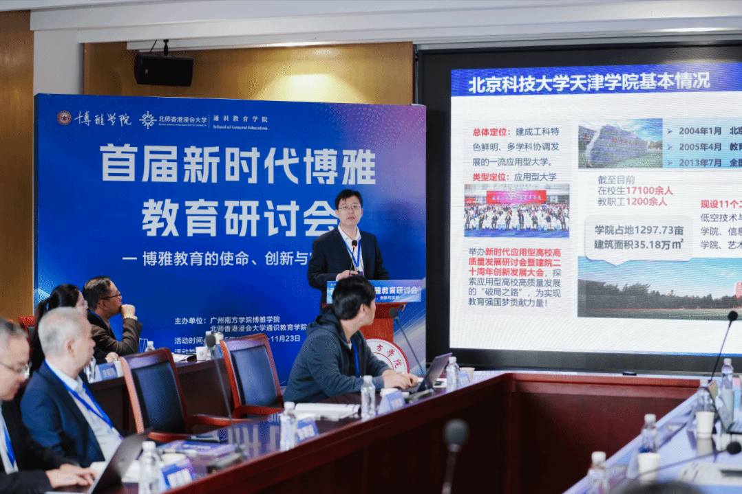 副院长刘晓明教授和北师大珠海校区美育中心主任、艺术教育系主任蒯卫华副教授共同主持。11月23日上午举行的“学以致用:博雅教育与应用型人才的全面发展”分论坛上,刘院长作了题为“育人为本 博雅为基 应用为用,促进应用型人才终身发展”的主题报告,报告系统阐述了学院在“专博融合”应用型人才培养方面的探索与实践,介绍了学院在顶层设计、课程革新和能力塑造三方面的具体举措,并分享了学院的育人成效。