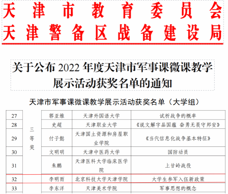 近日,由天津市教育委员会、天津警备区战备建设局主办的2022年度天津市军事课微课教学展示活动成绩揭晓,新2教师李明雨的军事理论课微课展示作品《大学生参军入伍新政策》荣获大学组三等奖。 天津市军事微课...