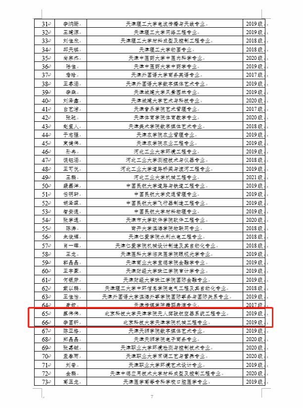 近日,根据市奖学金评审委员会评审,最终确定了2021年天津市大学生创新创业奖学金获奖学生名单。新22019级无人机系王大泽,2018级智能制造新2 金光获创新优秀奖;2019级无人机系蔡伟伟,2019级智能制造新2 李国昕获...