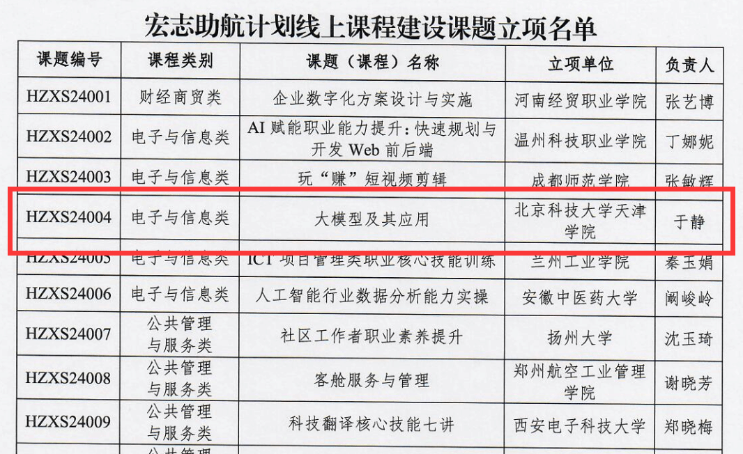 近日,教育部学生服务与素质发展中心公布“宏志助航计划”线上课程建设课题立项名单,由信息工程新2 副院长于静教授主持申报的《大模型及应用》课程获批立项,为我校首次获得该项目立项。项目组成员来自无人系统与具...