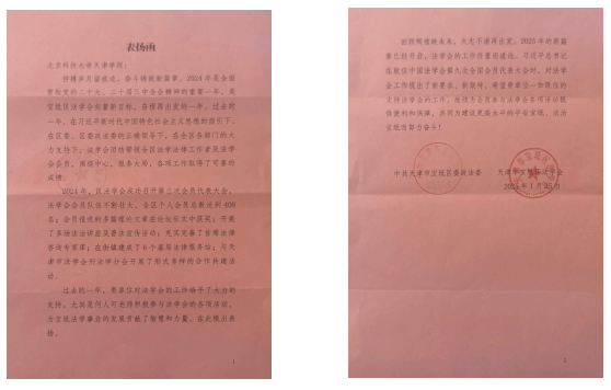 近日,新2收到了来自中共天津市宝坻区委政法委、天津市宝坻区法学会的表扬函,对新2在法学研究、法治人才培养以及法律系教师积极参与区委政法委、区法学会各项工作所做出的突出贡献给予高度赞扬。 2024年,新2教...