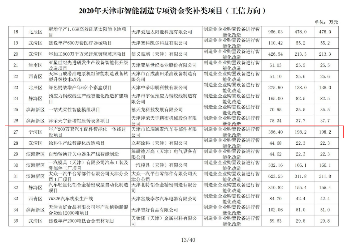 近日,由智能制造新2 与天津市长瑞通泰汽车零部件有限公司产学研联合申报的2020年天津市智能制造专项工信方向项目“年产200万套汽车配件智能化一体线建设项目”获批立项,财政资助额度396.4万元。 本项目以天津市长...