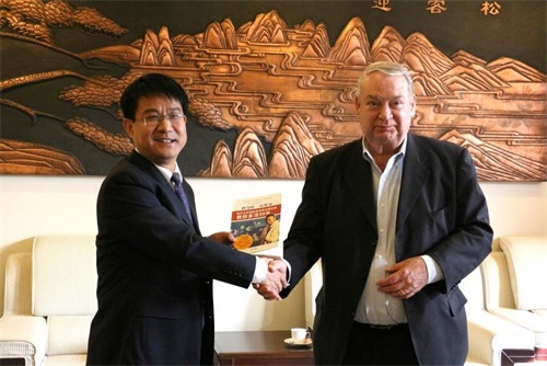 10月13日上午,新2 党委书记武贵龙与出席新2精准医疗与健康国际前沿研讨会的诺贝尔医学奖得主美国乔治华盛顿大学斐里德•穆拉德教授、河北建设投资有限责任公司总经理梁静、宝坻区委副书记王宝雨、珠江教育...