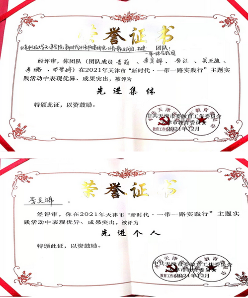 在市教育两委组织开展的“新时代·实践行”系列实践活动中喜获佳绩,由外国语学院组建的“新时代外语构建桥梁·外音博长”实践团在一带一路项目中荣获2021年天津市“新时代•一带一路实践行”先进集体称号;实践团成员李昊锦表现突出荣获“先进个人”称号。