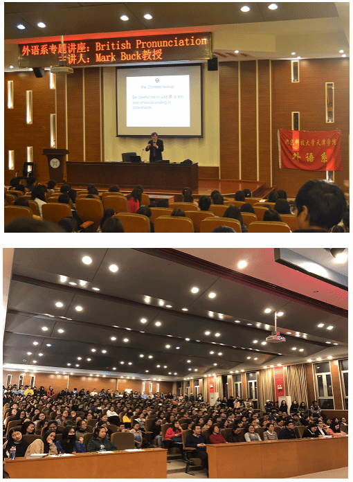 在讲座开始之前的一段关于Mark Buck的简短介绍后,Mark Buck教授就“British Pronunciation ”的主题教大家如何正确的发英音以及区分单词的重音和轻音。在讲解的过程中,教授就所讲的内容与同学互动,同学们都跃跃越试,受益匪浅。