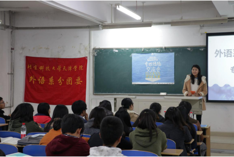 外语系分团委于2015年11月4日在8教105举行专四经验交流会。外语系分团委书记王研、外语系教师唐小彬老师、陈元元老师、虞娜芳老师出席本次活动。同时邀请13级专四成绩优异的学长学姐,就专四考试的备考经验和学习方法与外语系全体14、15级学生们进行深入交流。
