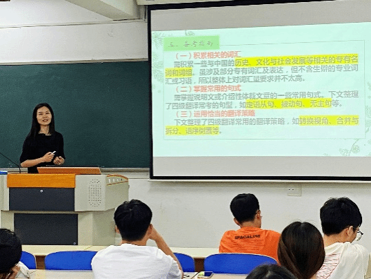 本次讲座由外国语学院项瑞翠老师主讲。项瑞翠老师从事大学英语教学工作十余年,具有丰富的大学英语四级教学和阅卷经验。项老师本次主要针对大学英语四级的阅读和翻译部分进行讲解。项老师结合自身的四级教学与辅导经验,对大学英语四级阅读和翻译部分的题型、考查重点、评分标准、解题步骤、解题技巧等方面进行了细致地分析和讲解,讲解了各部分的解题技巧,阐述了进行有针对性的练习和采取有效方法的必要性。她利用真题实例引导学生掌握在阅读过程中如何确定文章主旨、确定选项词性、提取题干关键词、确定正确选项和排除干扰选项,以及在翻译过程中如何理清原文层次、找主干和加枝叶。同时,项老师还穿插补充了英语词汇构成法、句子语法结构、四级翻译常考单词、短语及句型等基础且实用的知识点。参加讲座的学生认真听讲和记录,积极回答问题并与老师探讨解题方法和提高英语水平的途径。针对学生提出的问题和困惑,项老师及现场其他英语老师一一耐心解答,帮助学生明确了方向,开阔了思路,并鼓励学生努力冲刺即将到来的四级考试。
