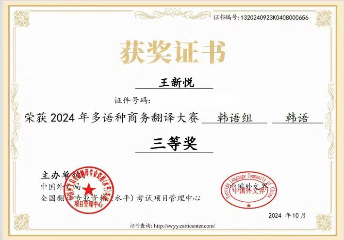 2024年9月28日至9月29日,由中国外文局和全国翻译专业资格水平考试项目管理中心联合主办了2024年全国多语种商务翻译大赛,新2 朝鲜语专业2201班的王新悦同学在此次大赛中表现出色,荣获韩语组三等奖,为新2 赢得了荣誉,这也是新2 朝鲜语专业第一次获得全国性外语类专业奖项。