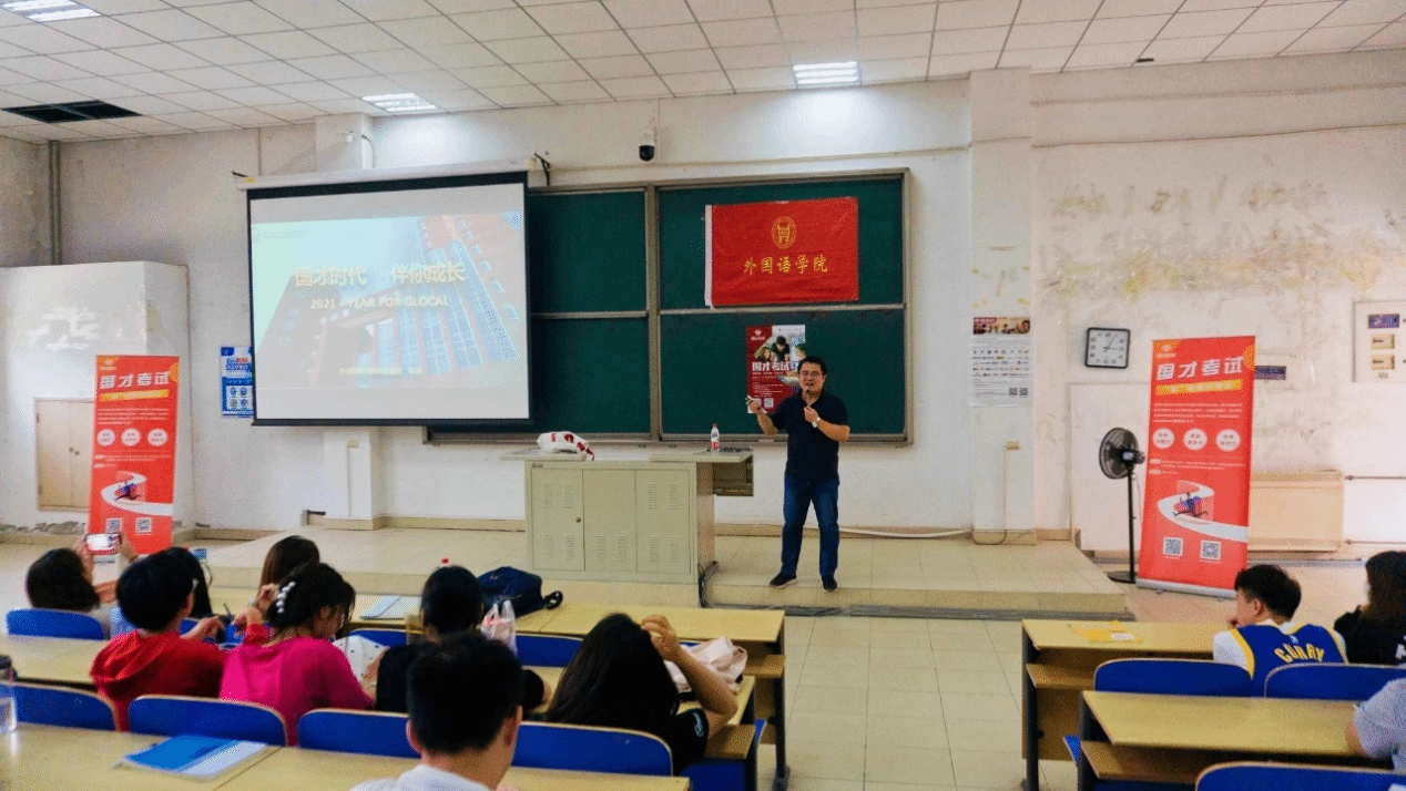 为推动外国语学院学风建设,为学校营造良好的英语学习氛围。外国语学院于9月15日下午15:00,在8教108举办了“外研社·国际人才英语考试”专题讲座。此次讲座我们特邀到了国才考试专题讲师张龙主讲。外国语学院教师,19、20级全体在校生以及新2