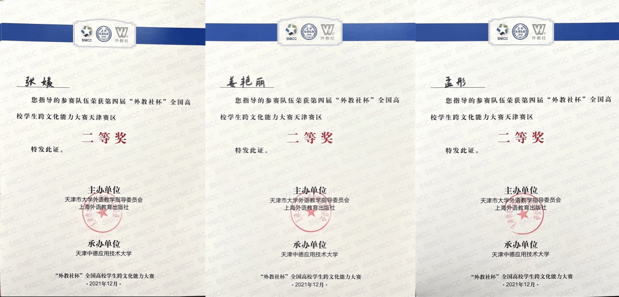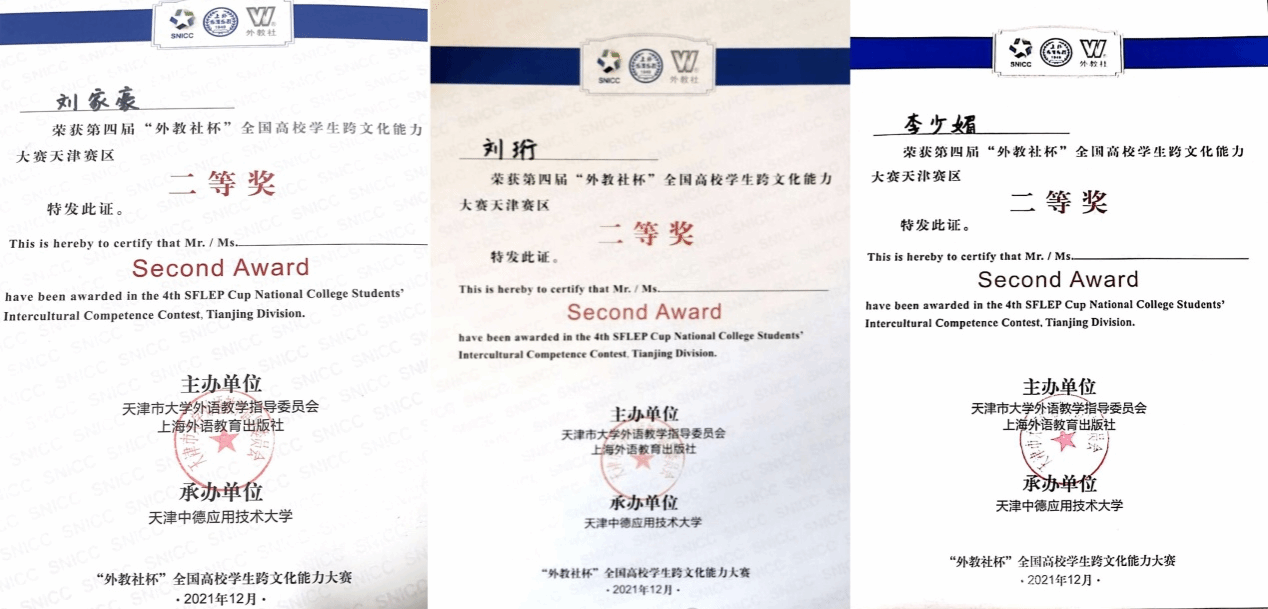 近日,在天津市外语教学指导委员会和上海外语教育出版社主办的第四届“外教社杯”全国高校学生跨文化能力大赛天津赛区比赛中,外国语学院三名同学取得佳绩,英语专业刘家豪同学、刘珩同学和日语专业李少媚同学荣获二等奖,指导老师为张媛、姜艳丽、孟彤。