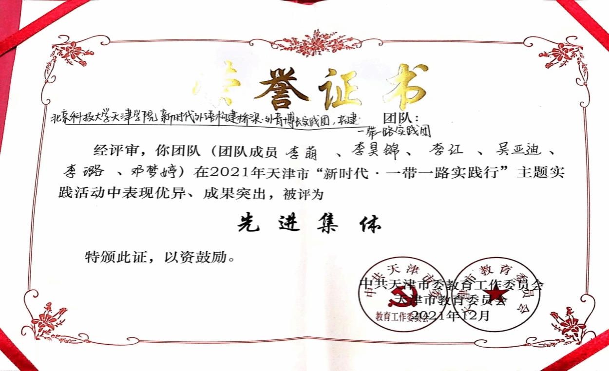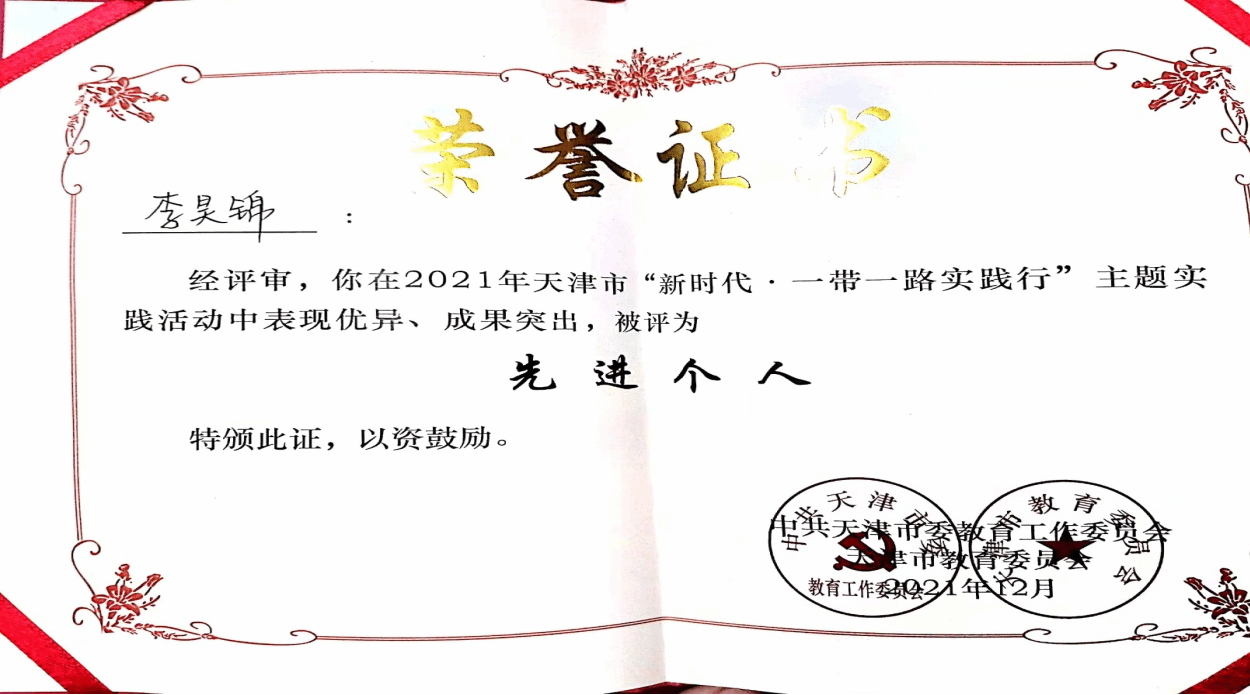 在市教育两委组织开展的“新时代·实践行”系列实践活动中喜获佳绩,由外国语学院组建的“新时代外语构建桥梁·外音博长”实践团在一带一路项目中荣获2021年天津市“新时代•一带一路实践行”先进集体称号;实践团成员李昊锦表现突出荣获“先进个人”称号。
