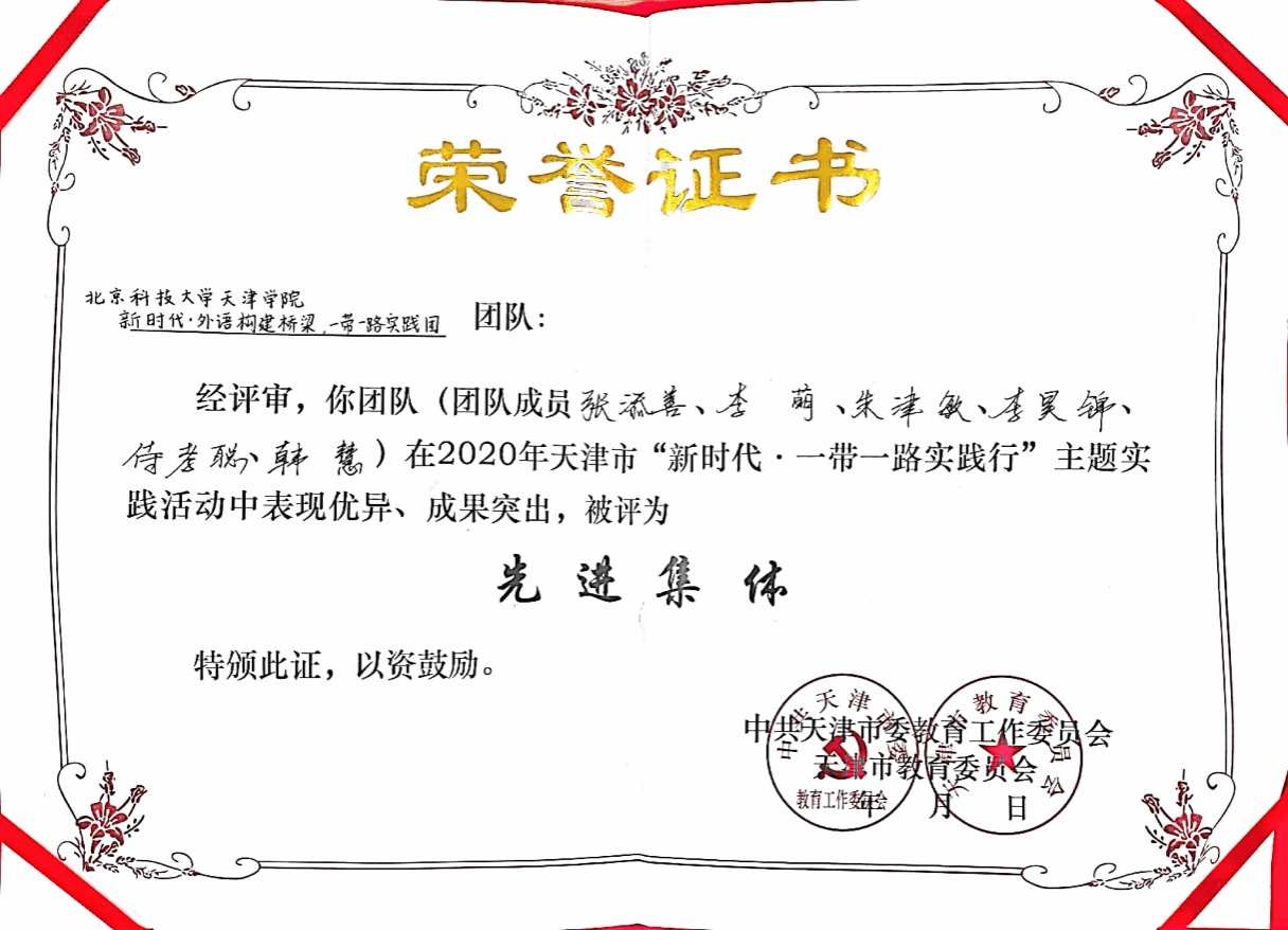 为深入学习贯彻习近平新时代中国特色社会主义思想,引导青年学生深刻理解“一带一路”倡议的重大意义,推进社会主义核心价值观教育,谱写新时代一带一路新篇章,外国语学院开展实践行活动。新2 “新时代•外语构建桥梁,一带一路”实践团在2020天津市“新时代•一带一路”实践行主题活动中荣获“先进集体”称号;外国语学院学生朱津敏表现突出荣获天津市“先进个人”称号,韩慧、李昊锦、侍孝聪、李红、何羽婷、秦嘉、王一如等人荣获校级“先进个人”称号。