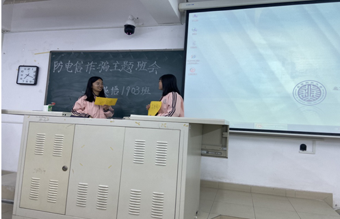 首先由19级辅导员孙雨馨为大家介绍大学生易遇见的“校园贷”和电信诈骗的各类“套路”以及危害性,并讲述近半年高校电信诈骗的典型事例向学生说明了增强防范网络诈骗意识的重要性,引导同学们要树立理性消费的观念,自觉抵制网贷诱惑,提高警惕,筑牢意识防线,保证自身合法权益。