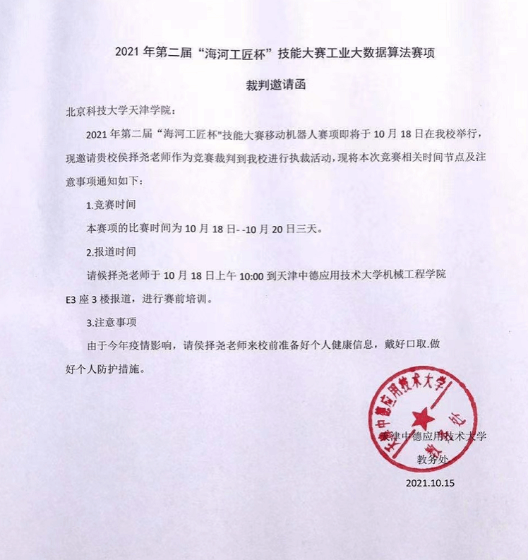 2021年10月18日,由天津市工业和信息化局、天津市人力资源和社会保障局、天津市教育委员会、天津市总工会和共青团天津市委员联合举办,天津中德应用技术大学承办的2021年第二届“海河工匠杯”技能大赛——全国工业和信息化技术技能大赛天津市选拔赛移动机器人赛项和工业大数据算法赛项如期举行,我系教师侯择尧受邀担任两项赛项裁判,圆满完成赛项执裁工作。
