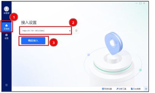 客户端软件安装完毕后。请运行软件,在接入设置框中填入://61.181.145.5:8443 然后点击“确定接入”。