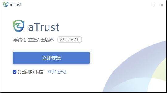 用户双击打开名为aTrustInstaller的客户端软件,在软件安装界面查看用户协议后,勾选“我已阅读并同意”后点击安装界面的 “立即安装”按钮,开始安装。